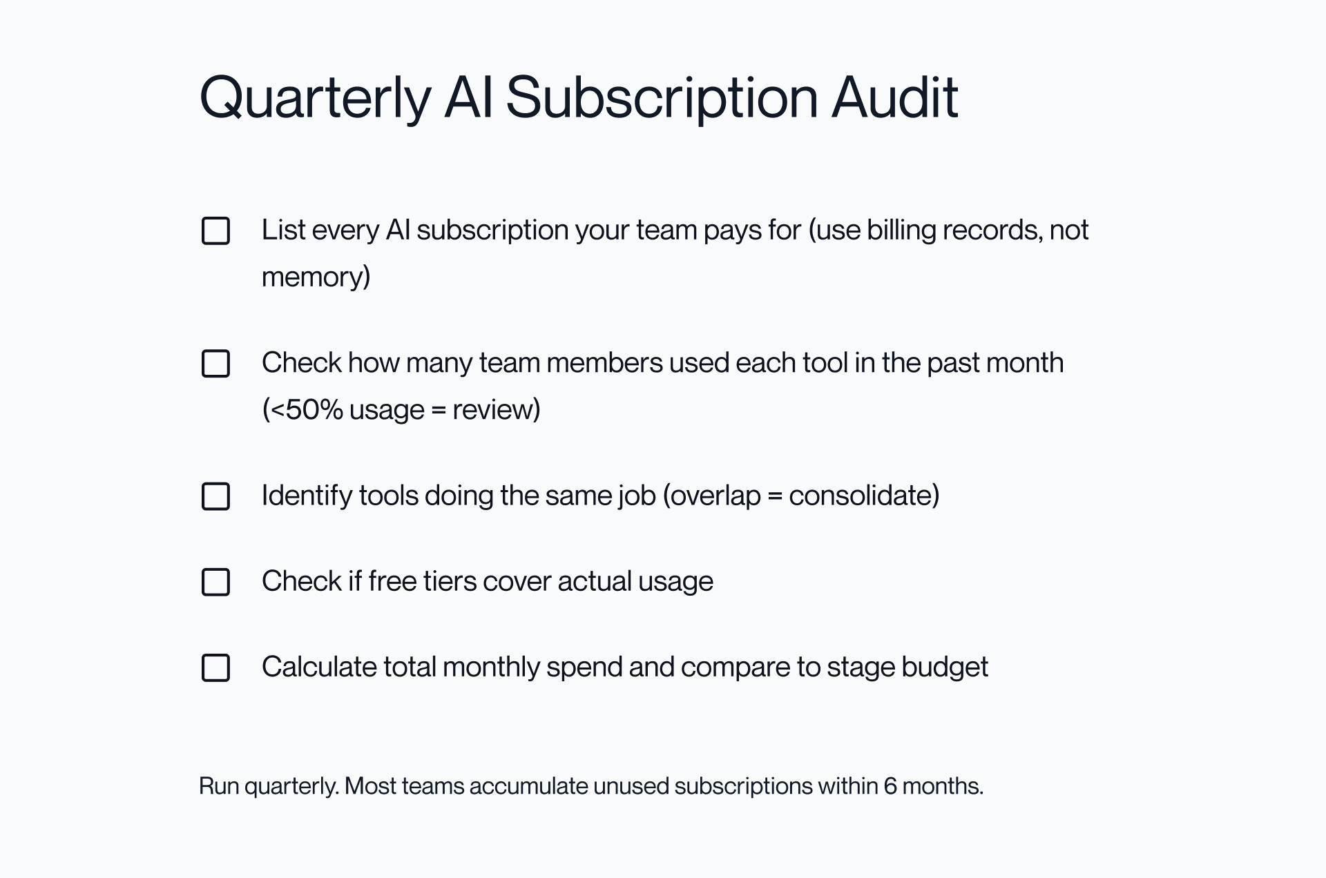 Run a full AI stack audit every quarter.