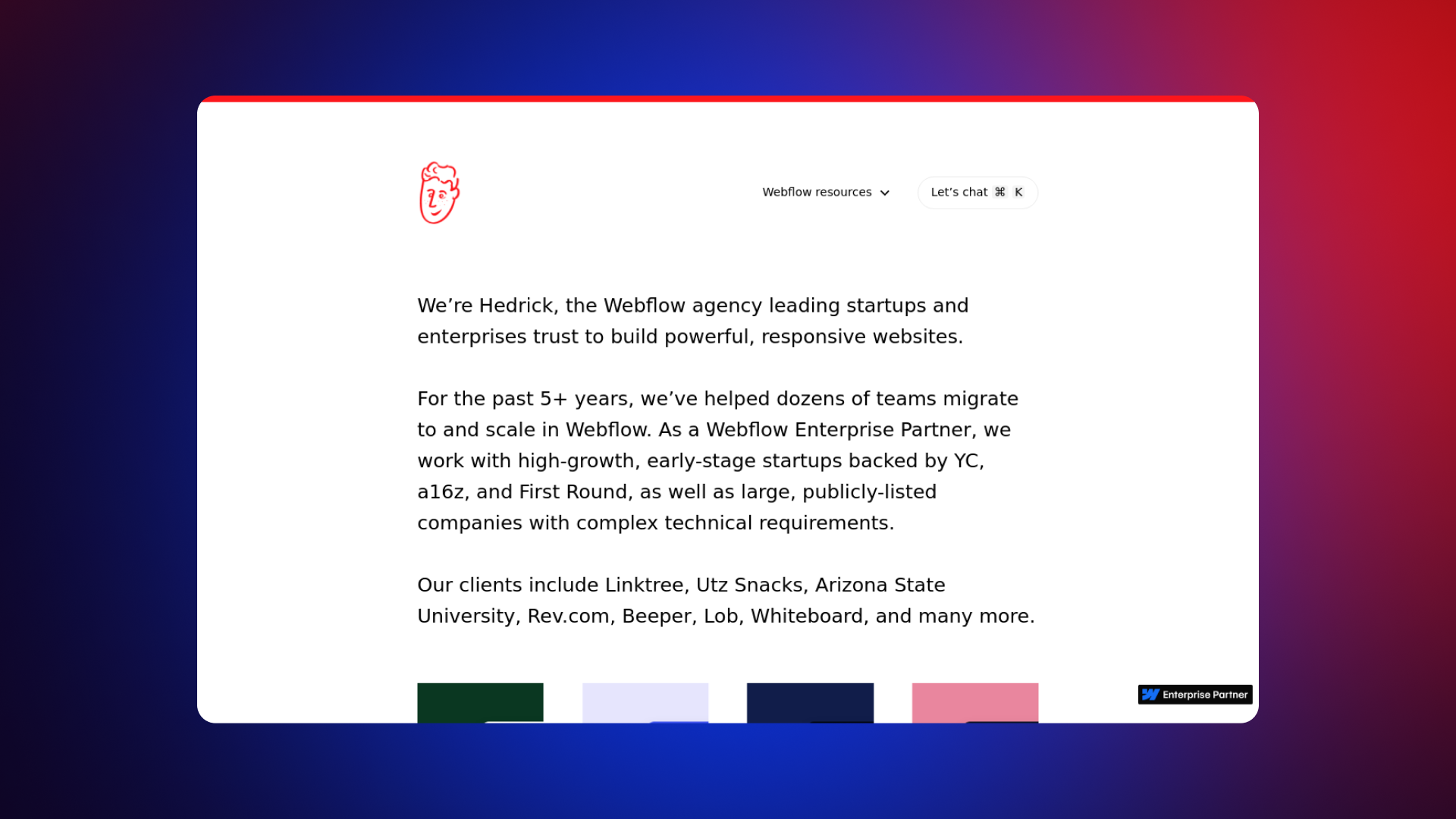 A trusted name in the Webflow space, Hedrick is a Webflow Enterprise Partner known for building high-performing, responsive websites. With over five years of experience, they specialize in migrations, custom builds, and scalable solutions for both startups and large enterprises. Their client list includes Linktree, Beeper, Lob, and Arizona State University, making them a go-to agency for complex, growth-focused Webflow projects.