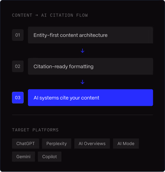 Every page gets structured so AI systems can extract, summarize, and attribute it. Entity paragraphs in the first 30% of content. Question-answer pairs in FAQ schema. Definition blocks LLMs can quote directly. Data tables and comparison matrices. "Short answer plus deep dive" format: the short answer becomes the citation snippet, the deep dive builds authority.